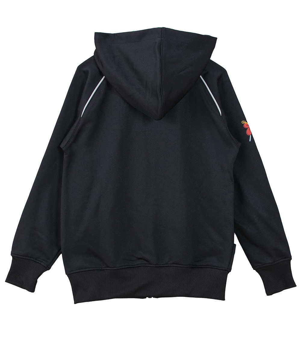 胸元にはブランドロゴとオウムの刺繍、袖にはハイビスカスモチーフをあしらい、スポーティーな中にも遊び心をプラスしました。
